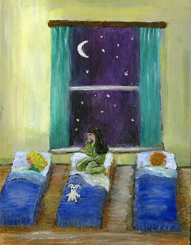 Gorgeous color paintings enhance the feel of Lucy’s woods experience and the comfort it involves, while dialogue throughout reflects Lucy’s respect for the newfound world she moves through: “You’re bluer than the sky, and you smell even better than leaves.” The flowers didn’t answer; they just bowed to her in the breeze. “I won’t ever pick you,” she told them. For in a book she had seen children carrying flowers into their house. “I would never take you inside, away from here.”